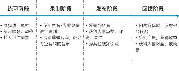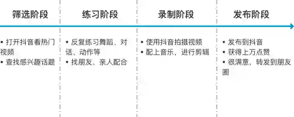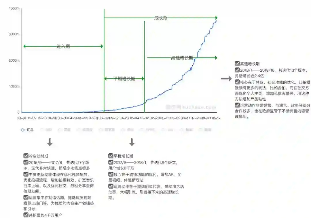 从上图中我们可以看到,抖音在产品初期迭代是非常频繁的,几乎每次迭代都有新功能上线,集中在视频拍摄、观看等方面,在降低用户拍摄门槛,提升用户观看体验上做了非常好的设计。