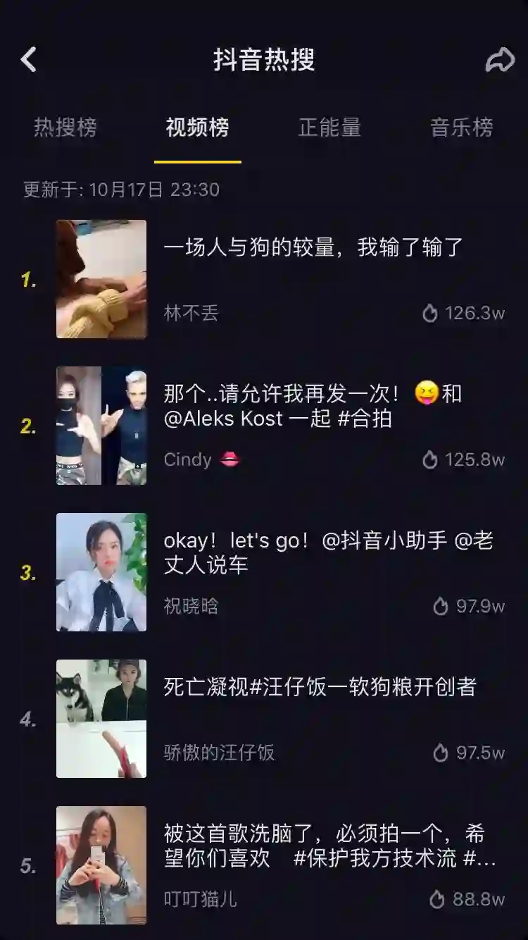 从实时热门视频榜来看,视频的热度都是百万级的,其中第一名的点赞量就达到257.3万,可见用户点赞习惯是非常好的。