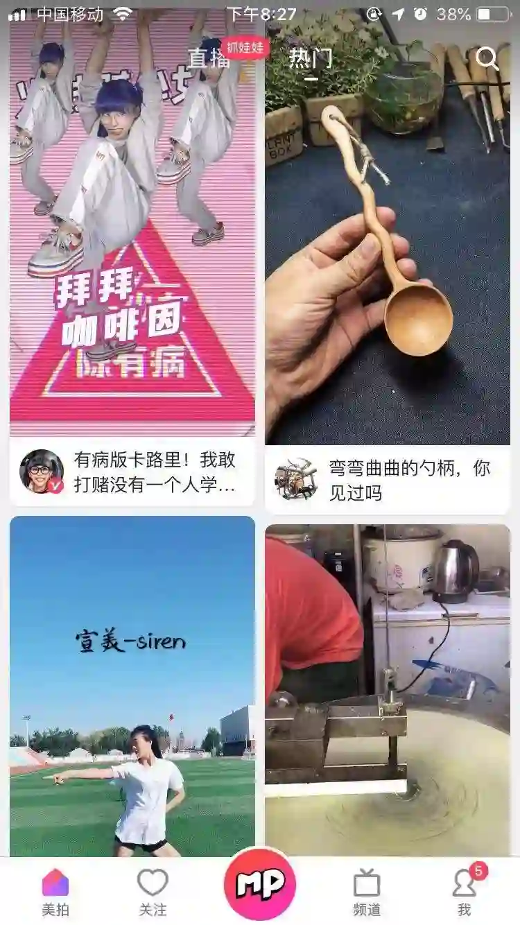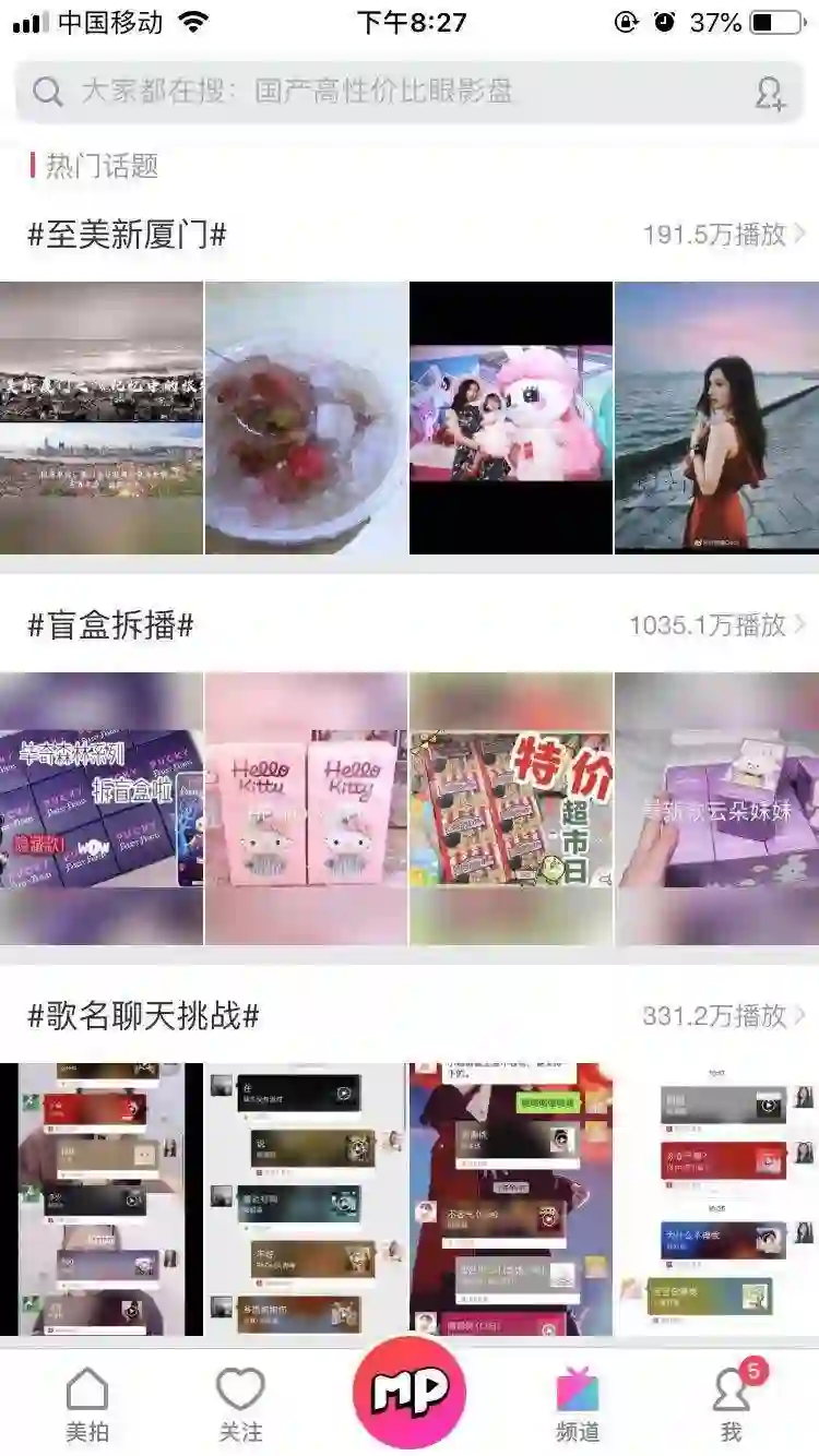 而美拍是瀑布流式,点击任意视频进入沉浸式上下滑动。因为美拍早期是视频剪辑工具,核心是“拍”。播放界面与抖音区别不大。