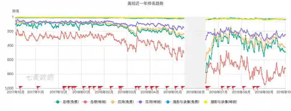 美拍的应用市场排名保持在五百名以内,虽与抖音有差距,但依然是非常好的排名。只是近几个月有所下降,在市场份额方面威胁明显。