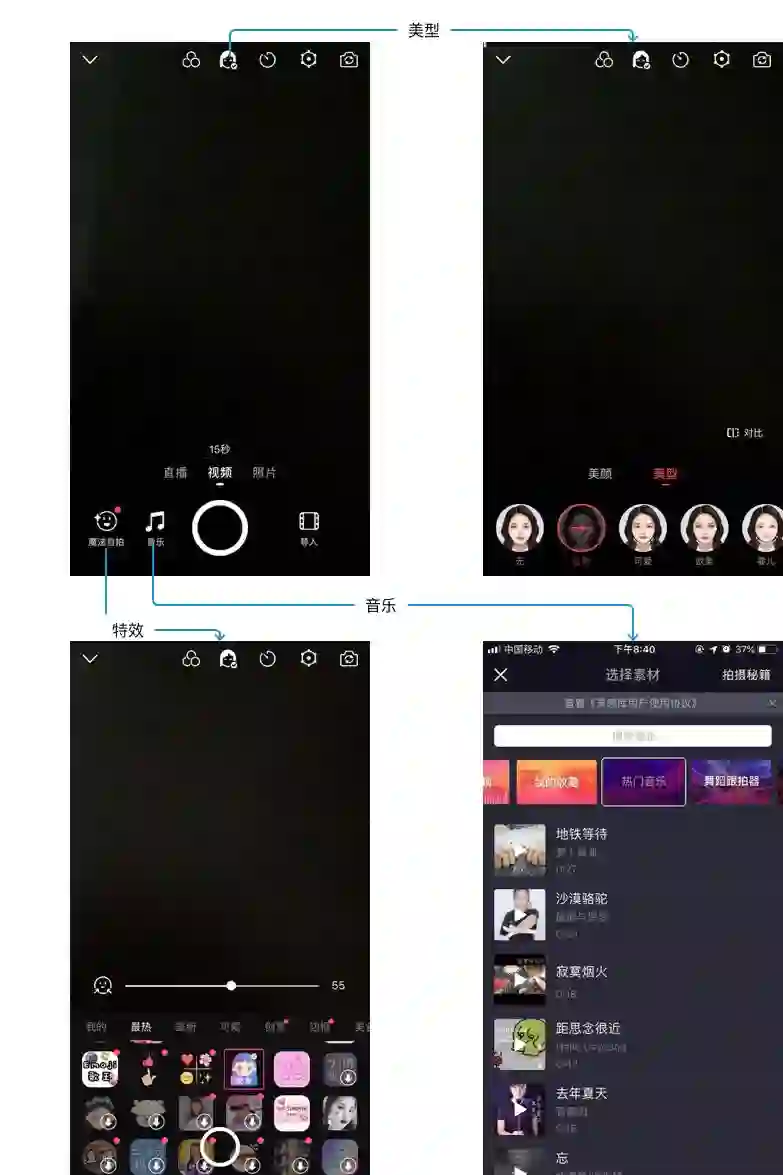 在最为核心的拍摄功能上面,基本功能与抖音一致,有些细节存在差异:
