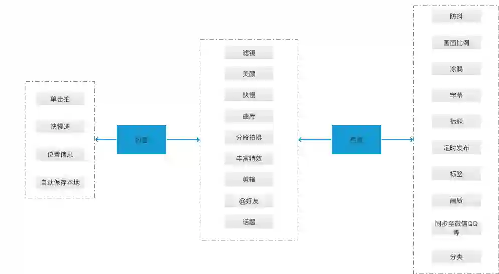 将以上分析总结如下图所示。美拍功能要复杂很多,也是源于其早期工具型的定位,以及美拍可以拍摄最长5分钟的视频。
