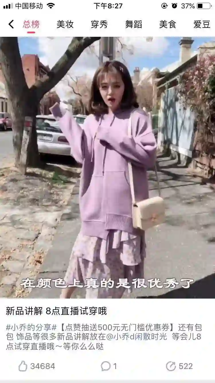 进入热门视频-总榜,排在第一位的为穿搭秀,点赞量3万多,与抖音的动辄几百万相比也是差距较为明显。