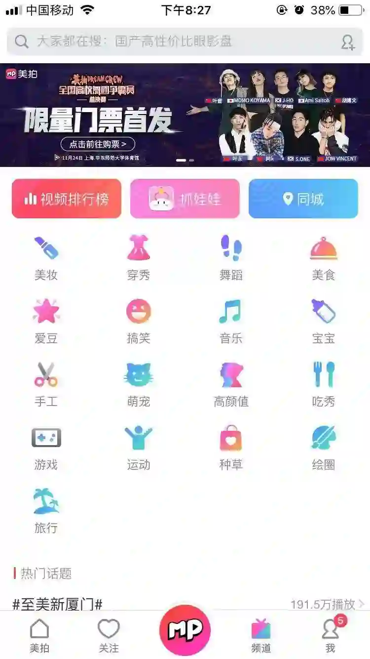 如下图所示,美拍专属的【频道】页面也是抖音没有的,在这个页面,排在前列的分类都是美妆、穿秀,也符合了美拍的女性用户需求,界面设计也非常少女心。