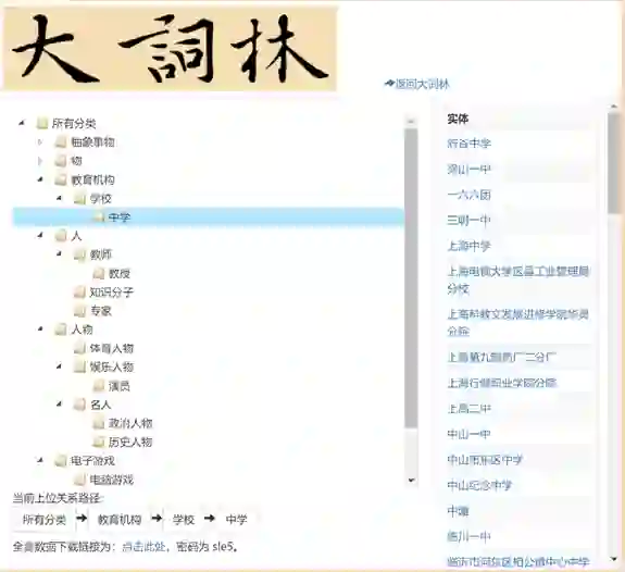 《大词林》(http://101.200.120.155/)是由哈尔滨工业大学社会计算与信息检索研究中心推出,由我中心秦兵教授和刘铭副教授主持开发,是一个自动构建的大规模开放域中文知识库。自2014年11月推出第一版《大词林》,《大词林》共经历了两次大的版本变化。第一版的《大词林》包含了自动挖掘的实体和细粒度的上位概念词,类似一个大规模的汉语词典,其特点在于自动构建、自动扩充,细粒度的上下位层次关系。第二版的《大词林》引入了实体的义项和关系、属性数据,将每一个实体的义项唯一对应到细粒度的上位词概念路径,让《大词林》中实体的含义更加清晰。