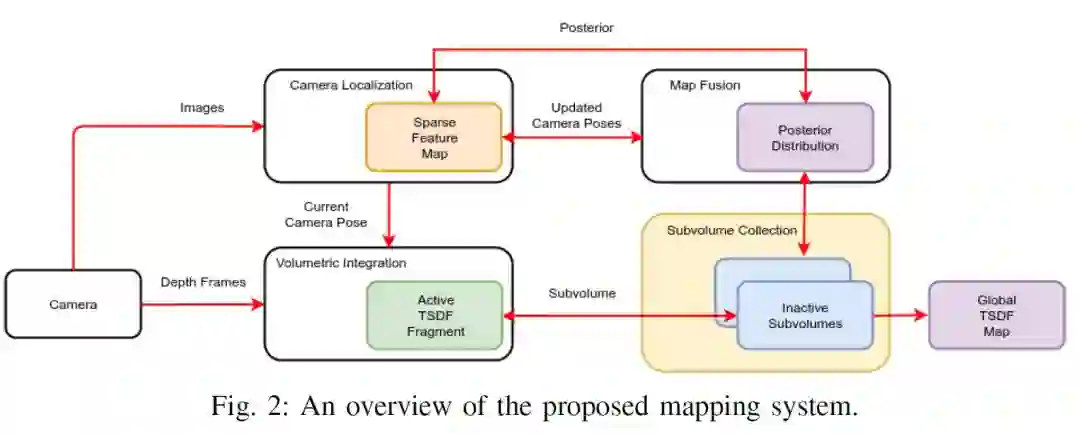 本文作者创建了一个可以解决地图一致性问题同时达到可量化标准的新型3D稠密地图系统,该系统以能代表环境的一系列重叠TSDF地图子卷为核心,它们用基于特征提取的相机跟踪和光束平差法进行定位。