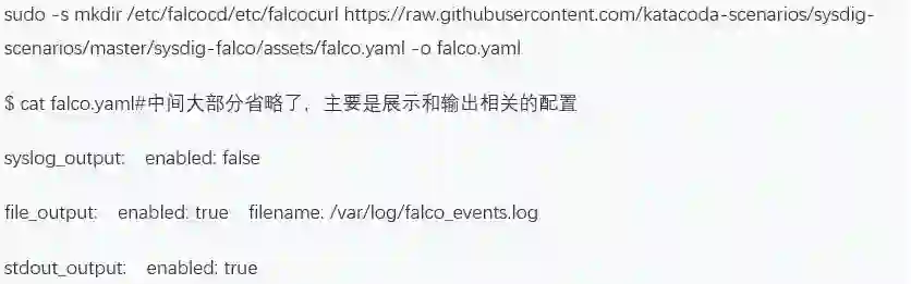 这次我们只是使用简单的文件输出来关注规则语法,但你也可以配置Sysdig Falco的自定义编程输出以向企业中的事件和报警系统发送通知。