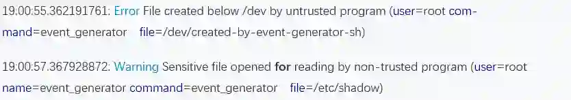 如果用>tail/var/log/falco_events.log来打开日志文件,我们应该能够看到类似下面的log: