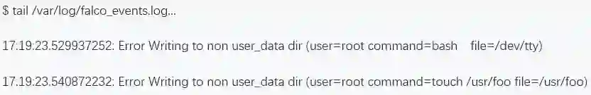 退出容器并接着查看日志文件tail/var/log/falco_events.log,你会发现两个异常事件: