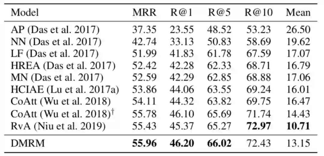 团队在VisDial v0.9和VisDial v1.0两个公开数据集上进行实验。VisDial v0.9包含了83k训练集,40k测试集,每一幅图像对应10轮对话和图像描述。VisDial v1.0包含了123k训练集,2k验证集和8k测试集。