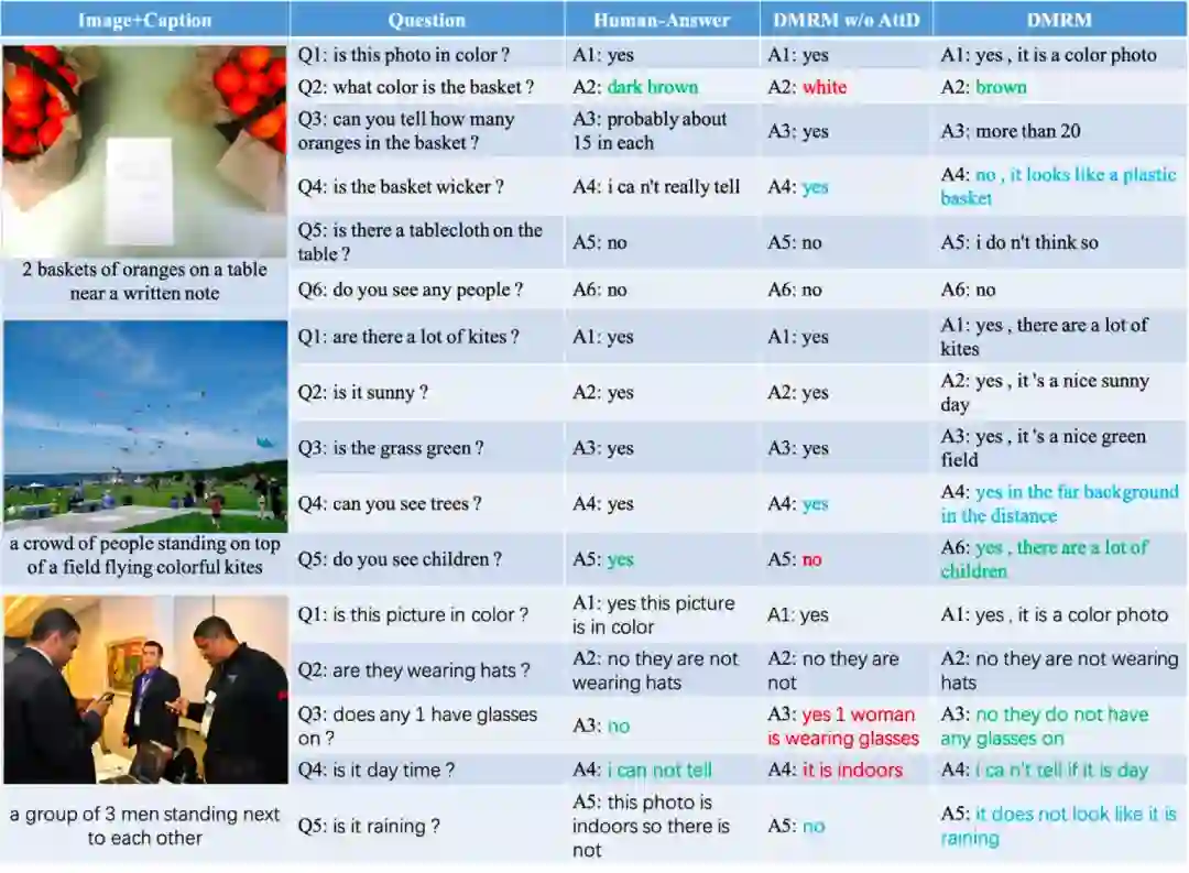 图4显示了DMRM模型生成的回答结果,融合了多模态解码器的DMRM模型在准确性和语义丰富性上表现更好。