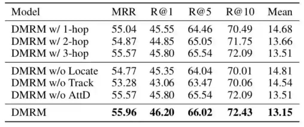 表3显示了双通道多步推理视觉对话生成模型DMRM的消融实验,分析了各个模块对于视觉对话任务效果的影响,可以看出双通道多步推理以及多模态解码器都起到了重要作用。