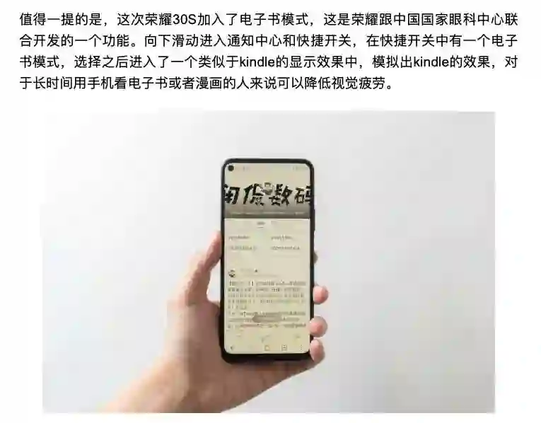 屏幕护眼方面,荣耀 30 Pro 还是挺全面的,针对 OLED 频闪问题内置了一个防频闪的选项;针对屏幕蓝光问题有一个护眼模式可以选择开启或者定时开启;还有比较火的深色模式和电子书模式,这部分体验我在荣耀 30S 的测评文章中写的也比较详细了。