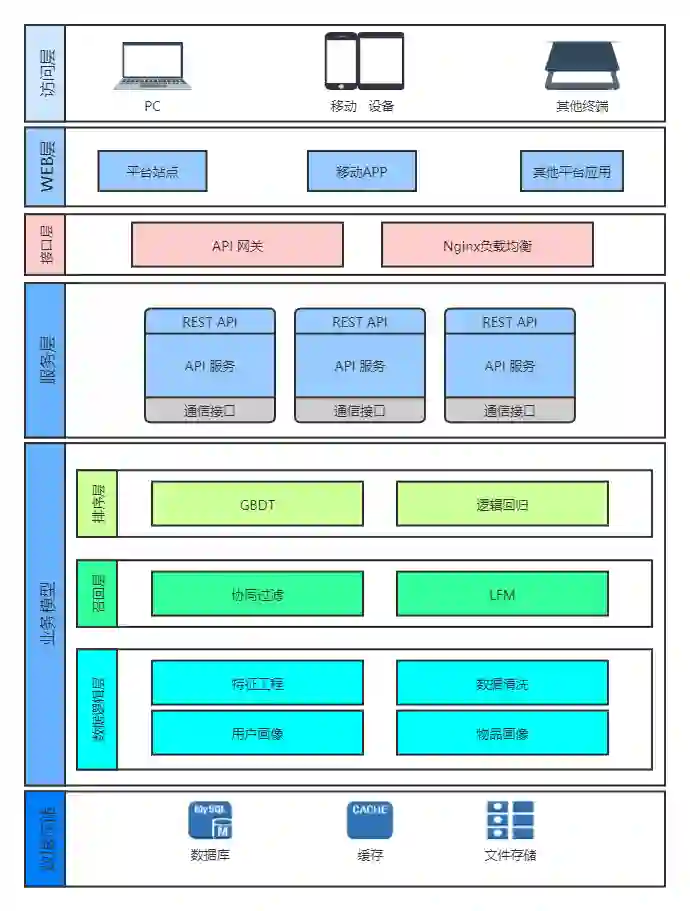 这张图是上个月给51CTO和第四范式做公开课的时候PPT中的一个图,这张图也是目前企业中将推荐系统落地的常见方式。我们从这张图中可以看到,实际上,一个推荐系统的落地从大的层面上我们可以将其分为6个部分。从下向上看,分别是数据存储、业务模型、服务层、接口层、web层和访问层。
