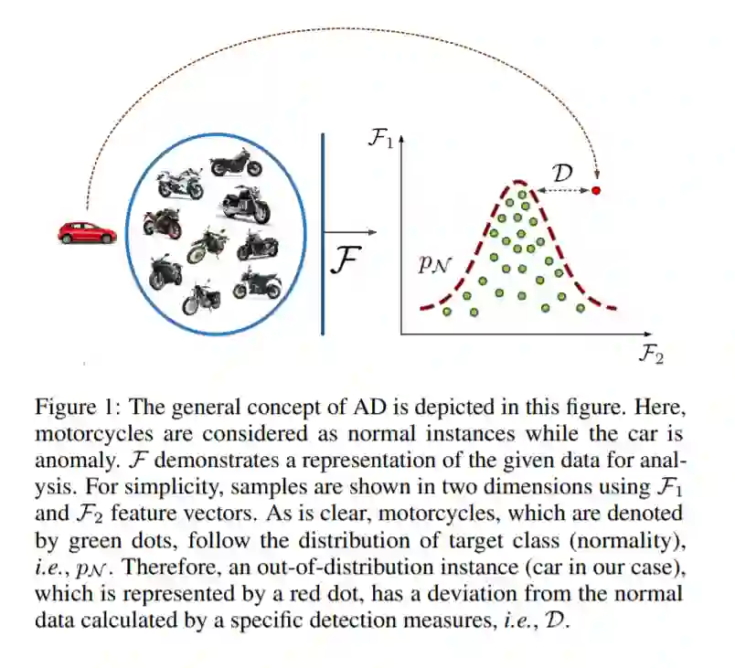 异常检测(AD)是指检测出可用的训练数据中很少出现甚至不存在的样本和事件。事实上,AD就是寻找看不见的概念的过程。一般来说,在AD环境中,有大量的数据实例遵循目标类分布,即正常数据。另一方面,属于分布外类(离群值)的样本不存在,或者很难访问,但代价是很高的计算成本。总之,任何未知的分布都可能导致异常,从而导致非常复杂的学习过程。因此,研究人员建议将所有正常数据中的共享概念提取为一个(几个)参考模型,而不是学习不规则性[Bertini et al., 2012; Sabokrou et al., 2015]。在测试阶段,一个实例与该模型的偏差表明它是否是异常。图1显示了AD概念的总体草图。