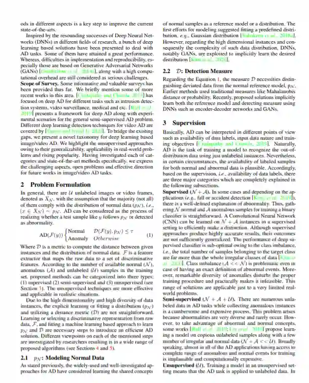 受深度神经网络(DNNs)在不同研究领域的巨大成功的启发,一系列基于深度学习的解决方案被提出来处理AD任务。他们中的一些人取得了很大的成绩。然而,实现和再现性方面的困难,特别是基于生成对抗网络(GANs)的困难[Goodfellow等人,2014a],以及高计算开销仍然被认为是严重的挑战。调研的范围。到目前为止,已经提供了一些信息丰富和有价值的综述。我们简要地提一下这一领域的一些最新作品。[Chlapathy and Chawla, 2019]关注深度AD用于不同的任务,如入侵检测系统、视频监控、医疗等。[Ruff et al., 2019]提出了深度AD的框架以及一般半监督的深度AD问题的实验场景。针对视频AD的不同深度学习检测技术已由[Suarez and Naval Jr, 2020]涵盖。