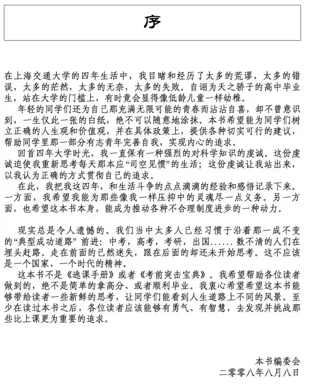 各位同学们,在本书的开始,我不得不遗憾地告诉大家一个消息。国内绝 大部分大学的本科教学,不是濒临崩溃,而是早已崩溃。在此,我无意争论是否复旦、中科大、或者清华、北大是否比我们崩溃的更少一些——这种争论是没有意义的。我只是看到了无数充满求知欲、激情、与年轻梦想 的同学们,将要把自己的四年青春,充满希望与信任地交给大学来塑造。 这使我心中非常不安。