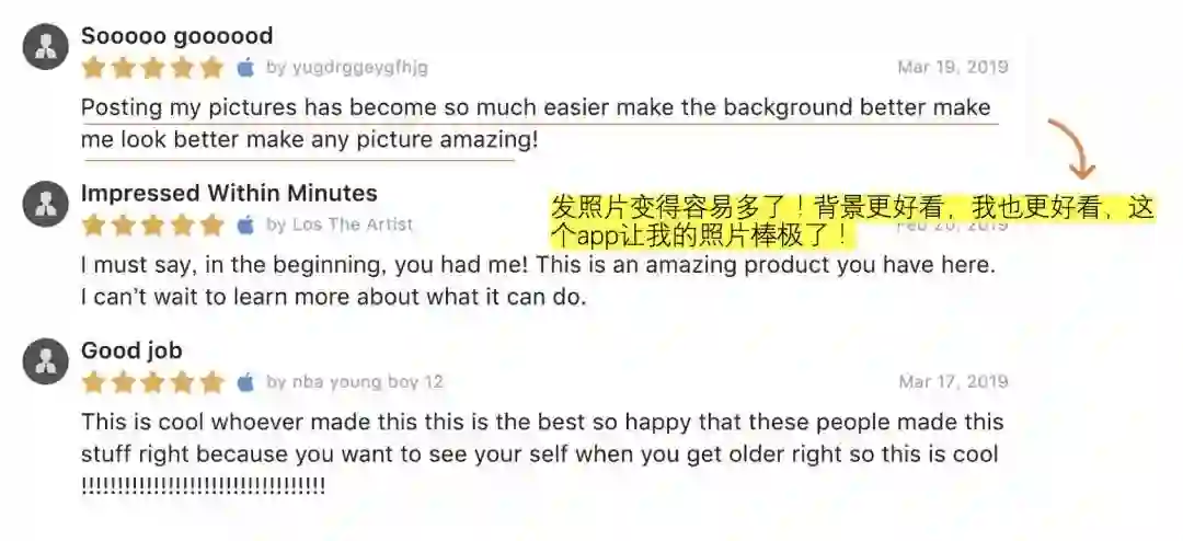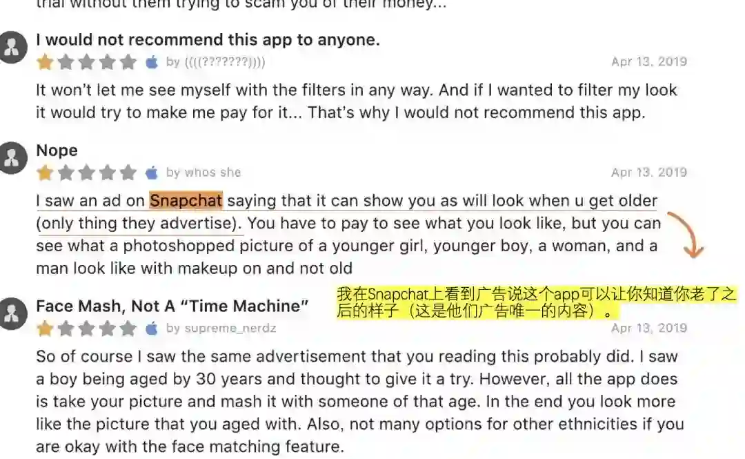 其次,通过App Store的评论来看,超过50%的用户是被Facetify“时光机”的宣传口号所吸引,想要了解自己年老后的样子才下载体验的。