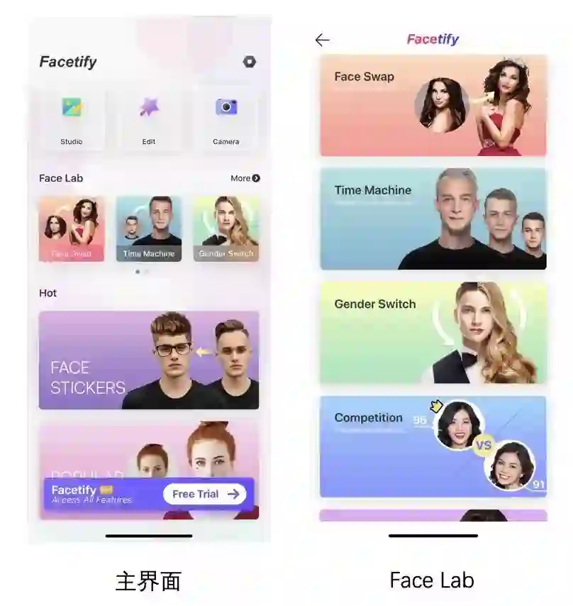 打开App,主界面比较简洁,包括变换年龄、变换性别、一键换妆、一键转换发型配饰等热门功能,点进“FaceLab”(脸部研究所)则包括专攻脸部的功能。