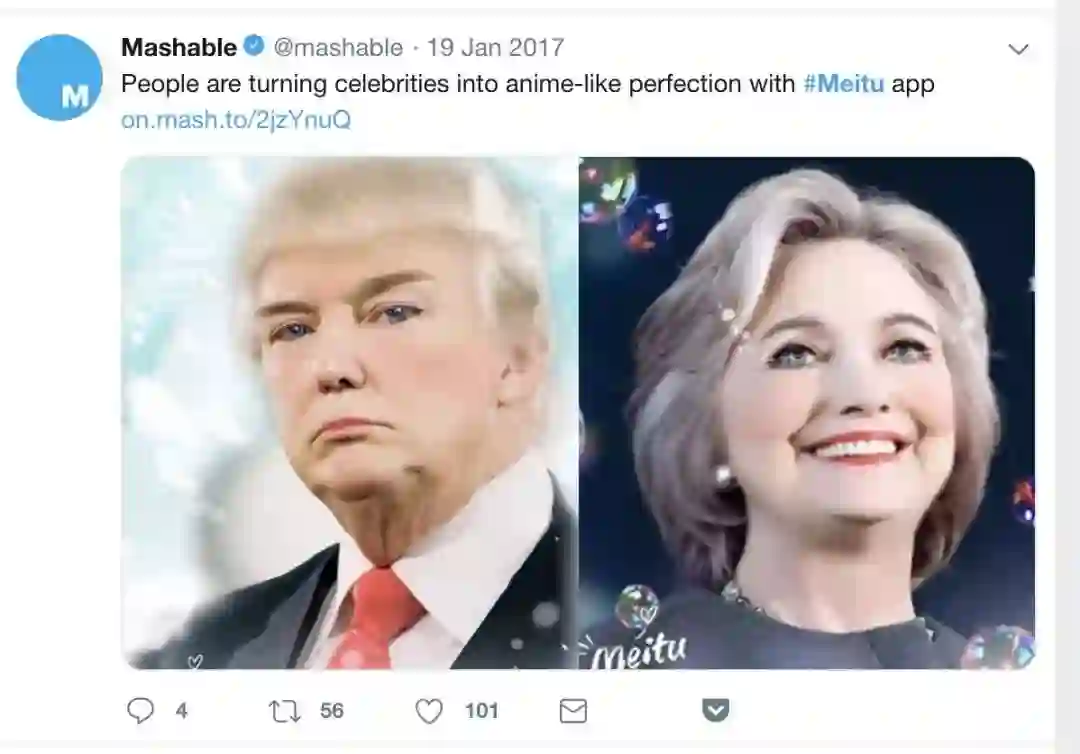 2017年初,美图秀秀意外在美国爆红,Instagram和Twitter上出现了一大波希拉里、特朗普的磨皮美颜萌照。