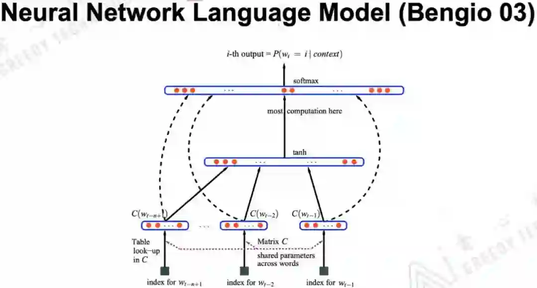 Neural Network Language Model根据之前的单词预测最新的一个单词,这里没有中心词的概念,只通过之前两三个单词来预测后面的一个单词。
