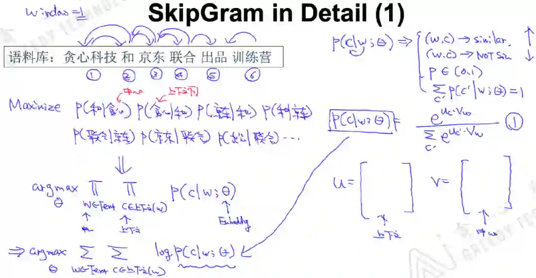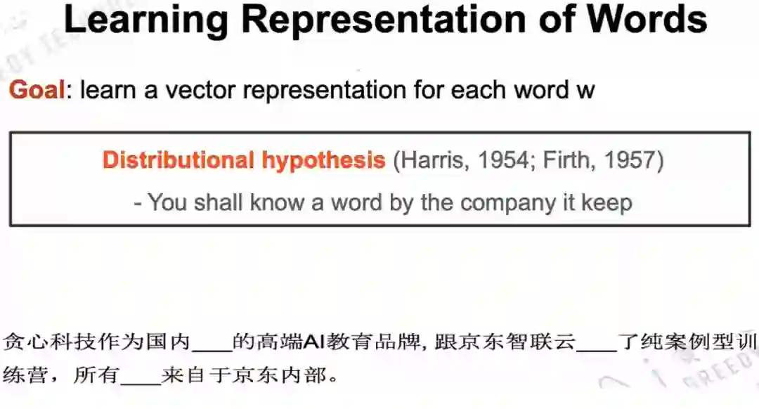 学习词向量有一个非常重要的理论:分布式假设,即一个单词的出现,跟它的上下文有关,我们可以根据上下文来预测某个单词。举个例子,我们可以根据上文“贪心科技作为国内”和下文“的高端AI教育品牌”,猜测出横线处应该是“领先”这个词。后边两个横线,分别从它们的上下文中,可以猜出应填词为“推出”、“案例”。