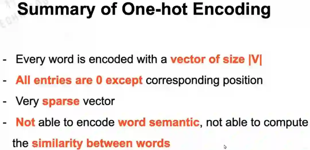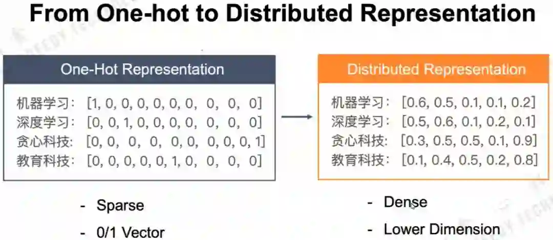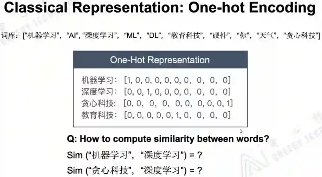 One-hot Encoding有什么问题呢?假如我想用余弦相似度计算上图中“机器学习”与“深度学习”的相似度,或者计算“贪心科技”与“深度学习”的相似度,我们会发现相似度的值都是相同的。也就是说,单词通过独热编码的方式是不能表示单词间语义的相似度。 由于这是独热编码最大的问题,因此科学家们开始研究如何对独热编码做改进,改进成一个向量可以表示单词的语义。如果我们能用一个向量表示单词的语义,那么两个向量的相似度应该可以表示两个单词语义的相似度。下图是我们对独热编码的一个总结。