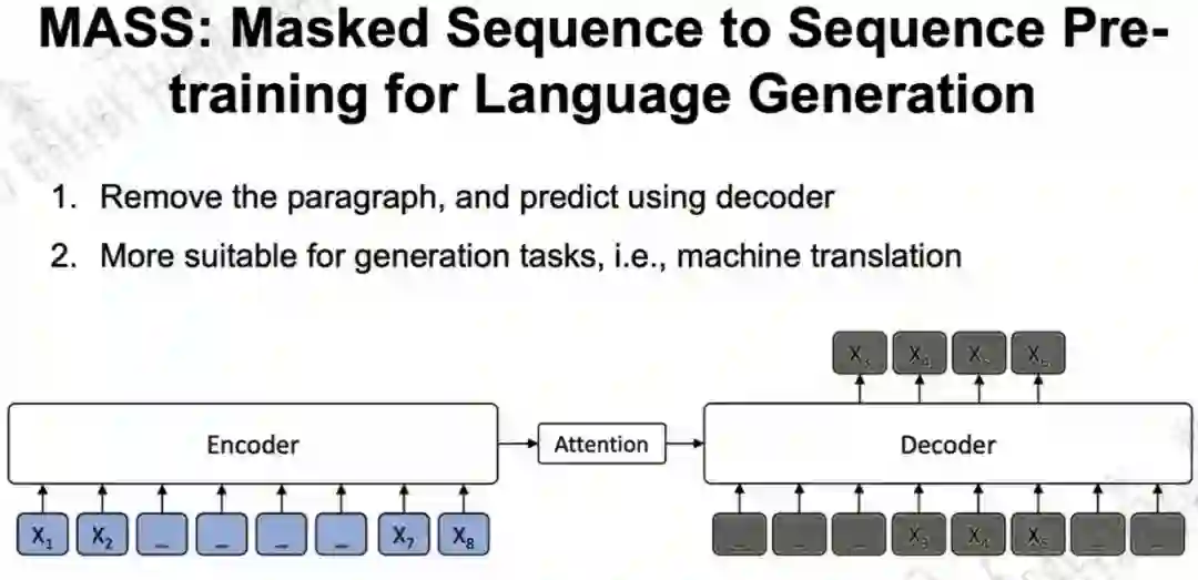MASS模型既使用了Transformer的Encoder部分,也使用了Transformer的Decoder部分。MASS的训练过程更像是Translation Machine的过程,它有点类似于上面提到的CoVe模型。MASS主要工作原理是:在Encoder的输入部分随机Mask掉一些单词,然后在Decoder部分预测输出被Mask掉的单词。
