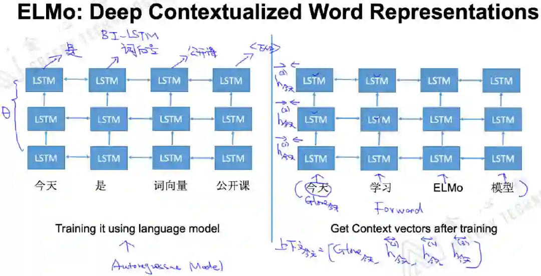 CoVe使用了机器翻译任务的Loss训练模型,而ELMo训练目标就是语言模型,根据上下文预测下一个单词。通过语言模型从左到右训练的方式,我们也叫做Autoregressive Model。