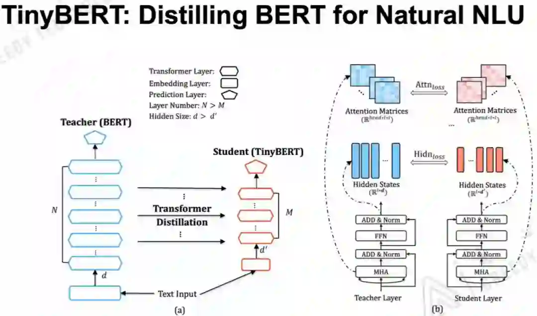 TinyBERT有两个模型如下图所示,左边的Teacher(BERT)有 层,右边的Student(TinyBERT)有 层,知识蒸馏就是把左边的模型迁移到右边的模型,且 。