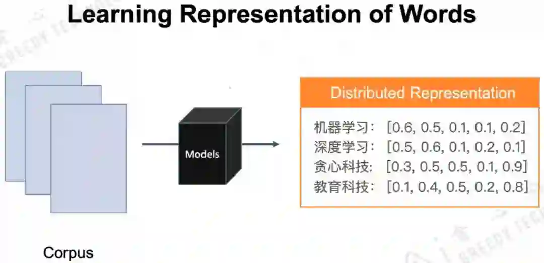 词向量需要通过词向量模型学习来得到。我们需要一批语料当作模型的输入,然后词向量模型可以选择SkipGram模型、Bert模型或者其它模型,最后就可以得到词的分布式表示向量。