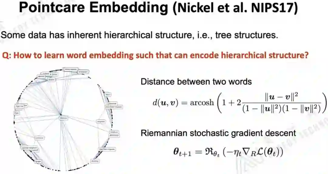 上面提到的模型是在欧式空间中进行的词嵌入,但是也存在一些非欧式空间的一些场景,比如计算地球仪中两个点之间距离。尤其是在物理学和天文学中,有很多非欧式空间的场景,比如一些非欧式空间的数据有层级结构或树型结构。