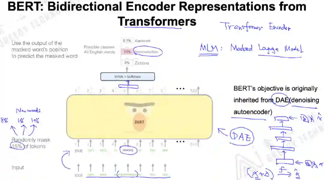 BERT使用Transformer的Encoder结构作为自己的组件。BERT训练的时候,随机把语料库中15%的单词做Mask操作。对于15%的单词做Mask操作分为三种情况:80%的单词直接用[Mask]替换、10%的单词直接替换成另一个新的单词、10%的单词保持不变,用这种方式训练的语言模型叫做MLM(Masked Language Model)。其实BERT的目标函数的核心思想来自于图像领域的DAE。