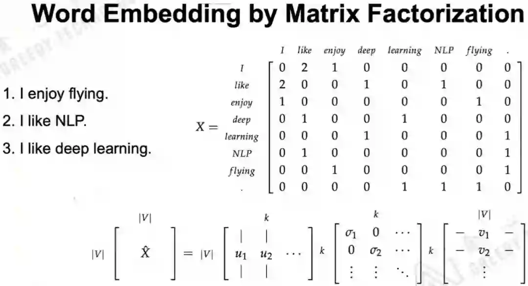 矩阵分解也是可以学习词向量的。假如我们有三个句子组成的语料库:I enjoy flying. I like NLP. I like deep learning. 我们可以统计出单词的共现矩阵(Co-occurrence Matrix) ,将共现矩阵行(列)作为词向量。例如:假设统计窗口大小为 ,“I like”出现在第 , 句话中,一共出现 次,所以“I like”= 。对称的窗口指的是,“like I”也是 次。将共现矩阵行(列)作为词向量表示后,可以知道“like”、“enjoy”都是在“I”附近且统计数目大约相等,因此它们意思相近。
