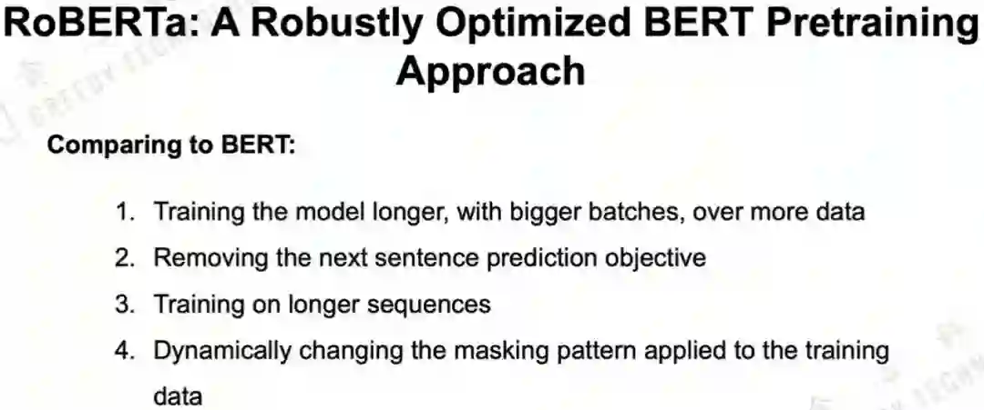 基于BERT有很多的改进,比较直接的改进是RoBERTa。这个模型针对BERT来讲没有太大的区别,更多的还是在训练的过程中做了一些改进,所以总结起来有四点改进:
