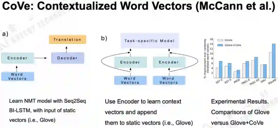 从下图b)中我们可以知道,由于Encoder和Decoder都是BI-LSTM模型,模型本身含有语句上下文的信息。因此,用静态词向量输入Encoder编码器就可以得到含有上下文的词向量。我们把含有上下文的词向量和静态的词向量拼接在一起,就可以解决某些特定的任务。