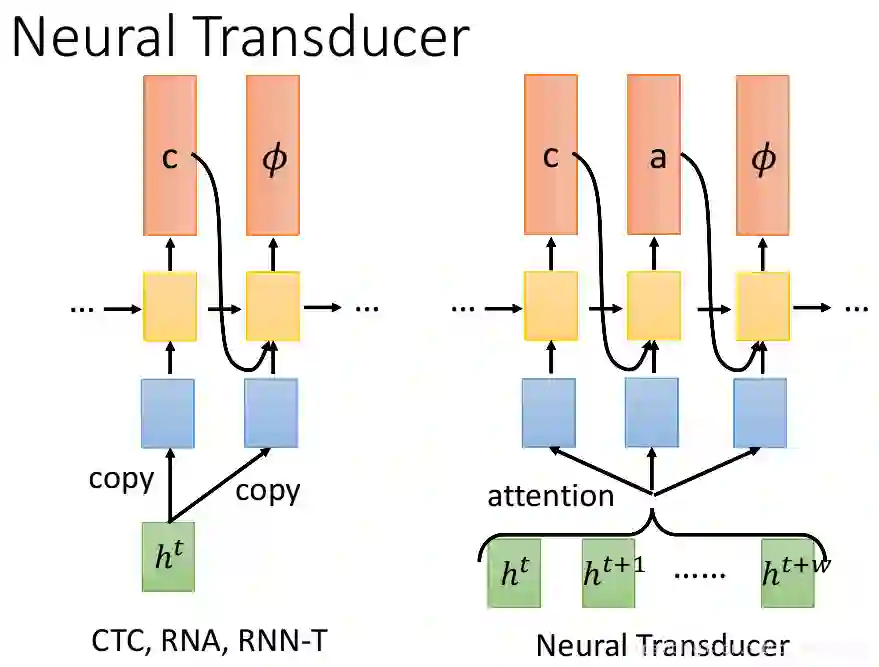 上面讲的CTC、RNA、RNN-T 都是只读一个h进来进行输出,感觉效率不高,而Neural Transducer一次读一段长度为W的h,之后在这个区域内做attention,由attention来决定选择读哪些进入RNN输出。