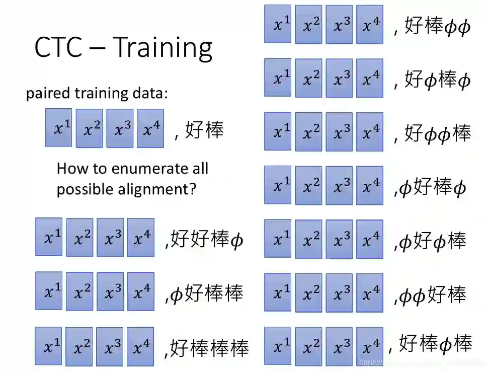 如 好棒 的输入 是 x1 x2 x3 x4的声音讯号,输出可以自己构造为 𝜙 好 𝜙 棒(那其他种,如 好𝜙棒棒等等也是可以的。alignment有很多种方式),那我们该选那一种alignment呢,全都要,穷尽所有的alignment下一节会讲。