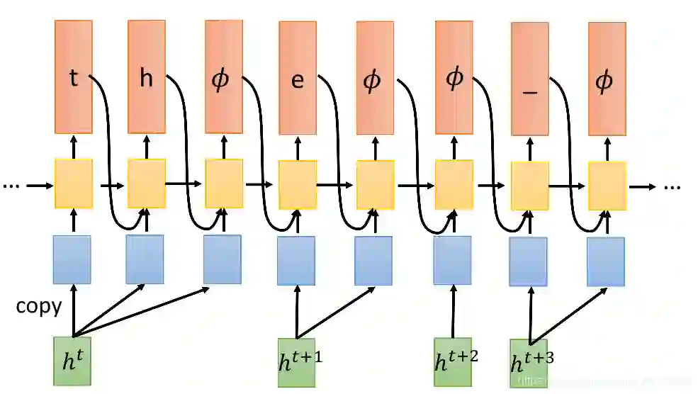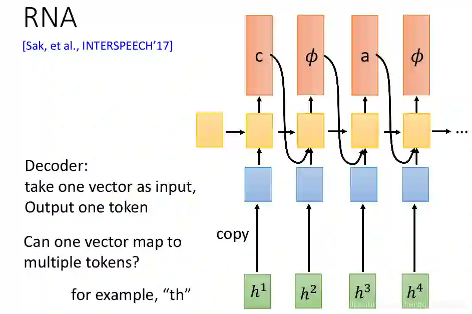 但注意,我们输入的x是acoustic features,它所代表的声音讯号非常小,仅10ms。这一小个feature不一定是一个token,故我们加入一个特别的token,𝜙 (拼音:nuo 四声),代表暂时不知道的。