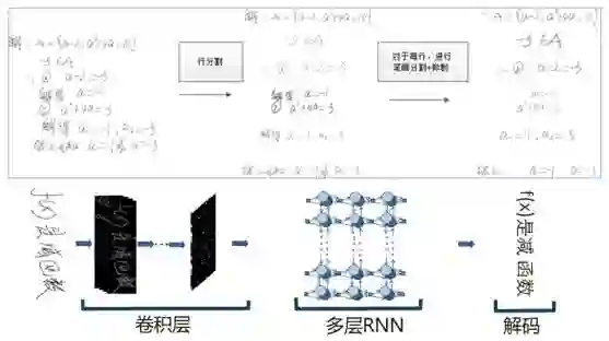 学生手写的解题答案,首选通过卷积层神经网络进行初步计算,之后通过循环神经网络形成有梯度的数据结构,最后到达解码层进行解码。