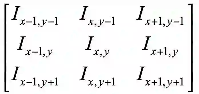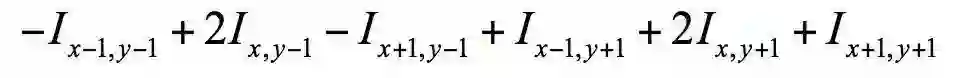 卷积运算用一个称为卷积核的矩阵自上而下、自左向右在图像上滑动,将卷积核矩阵的各个元素与它在图像上覆盖的对应位置的元素相乘,然后求和,得到输出像素值。以Sobel边缘检测算子为例,它的卷积核矩阵为: