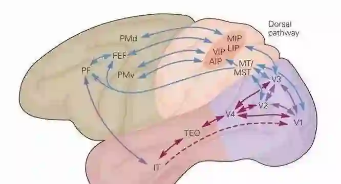 目前已经证明,视觉皮层具有层次结构。从视网膜传来的信号首先到达初级视觉皮层(primary visual cortex),即V1皮层。V1皮层简单神经元对一些细节、特定方向的图像信号敏感。V1皮层处理之后,将信号传导到V2皮层。V2皮层将边缘和轮廓信息表示成简单形状,然后由V4皮层中的神经元进行处理,它颜色信息敏感。复杂物体最终在IT皮层(inferior temporal cortex)被表示出来。