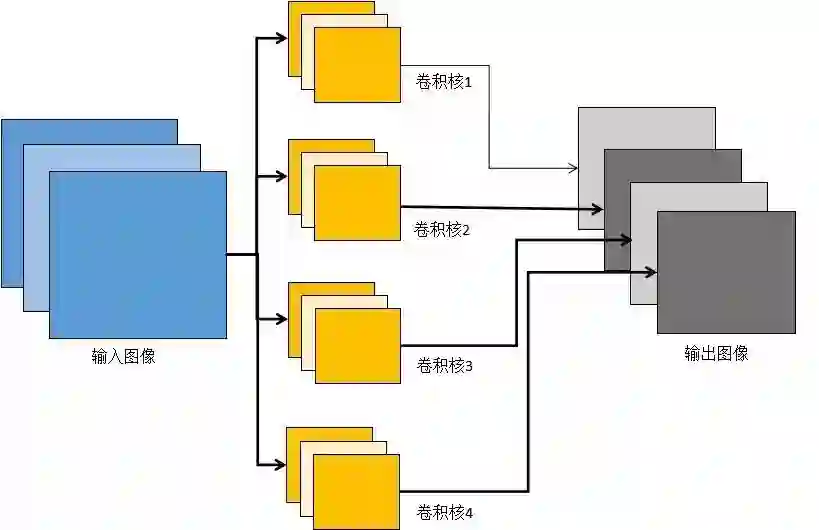 在上图中卷积层的输入图像是3通道的(图中第1列)。对应的,卷积核也是3通道的。在进行卷积操作时,分别用每个通道的卷积核对对应通道的图像进行卷积,然后将同一个位置处的各个通道值累加,得到一个单通道图像。在上图中,有4个卷积核,每个卷积核产生一个单通道的输出图像,4个卷积核共产生4个通道的输出图像。