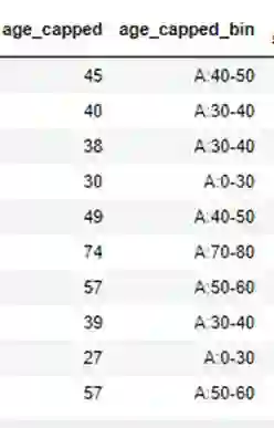 那么我们可以采用分桶法,处理后每个值被赋予它所应在的一个属性,这样一来数值特征便被转化为分类特征。以下是分桶后的输出样例。