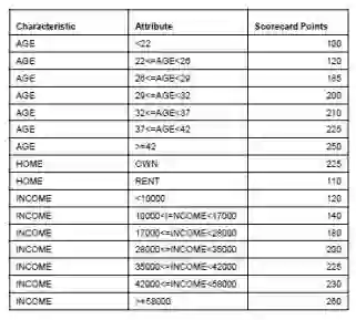 本文会介绍最受欢迎的信用评分方法,我们称为评分卡模型。有两个原因使其成为主流的方法。首先,评分卡模型很容易跟没有相关背景和经验的人(诸如客户)解释说明。其次,评分卡模型的开发过程很标准且被广泛接受,这意味着公司不需要投入太多研发经费。以下是评分卡的样例,后面会讲到如何使用。