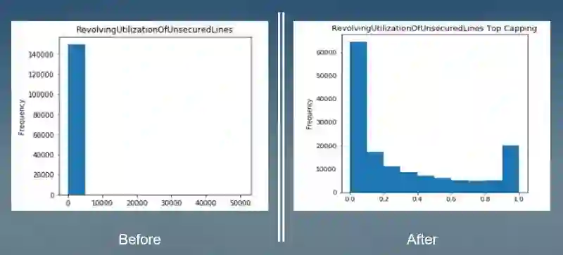 接下来处理异常值。总体来说,需要根据异常的类型进行处理。例如 如果异常值是由机械错误或测量导致的,可以用缺失值的方法进行处理。在这个数据集中有很大的数值,不过这些值看起来都很合理,所以取top/bottom coding。图3中表明当采用top coding后,数据分布看起来更接近于正态。