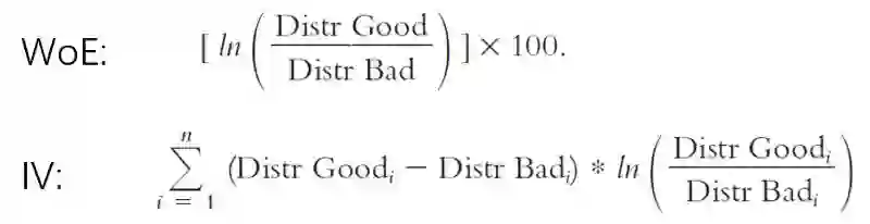所有特征分组后,特征工程就完成了。接下来是计算每个属性的证据权重(WoE)以及每个特点(特征)的信息价值。之前提到将所有数值类型都分桶处理后转换为分类型特征。然而不能直接用这些分类模型去拟合模型,所以需要给这些分类特征赋予一些数值。计算证据权重(WoE)的目的是为每个分类变量分配一个唯一值。信息价值(IV)用来衡量特征的预测力,将被用于特征选择。下面给出WoE和IV的公式。这里“Good”意思是客户不会有严重逾期或者目标变量=0,而“Bad”客户会产生逾期目标变量=1.