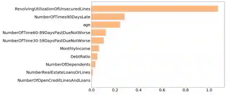 绘制一张柱状图,方便比较各种特征的IV。从柱状图中可以看到最后两个特征“NumberOfOpenCreditLinesAndLoans”和 “NumberRealEstateLoansOrLines”的IV值较小,因而只选用其他8个特征训练模型。