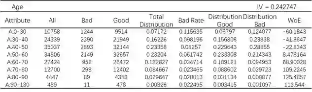 算完这些之后,评分卡开发就完成了,图7中列出了评分卡的部分结果。