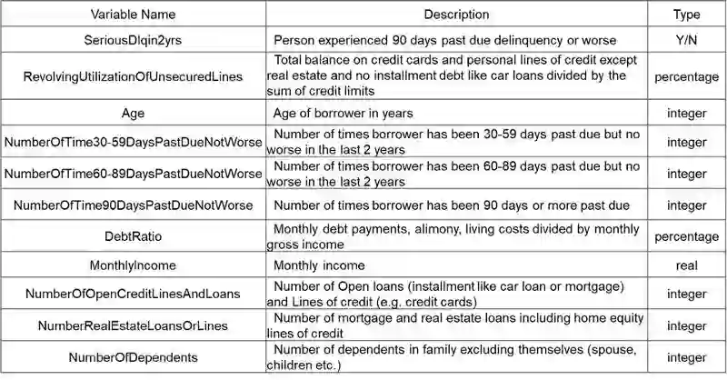 接下来将详细说明如何开发评分卡模型。我用的数据集来自Kaggle竞赛。 图2列出该数据集的数据字典信息。其中第一个变量是目标变量,二元分类变量,其余变量是特征。
